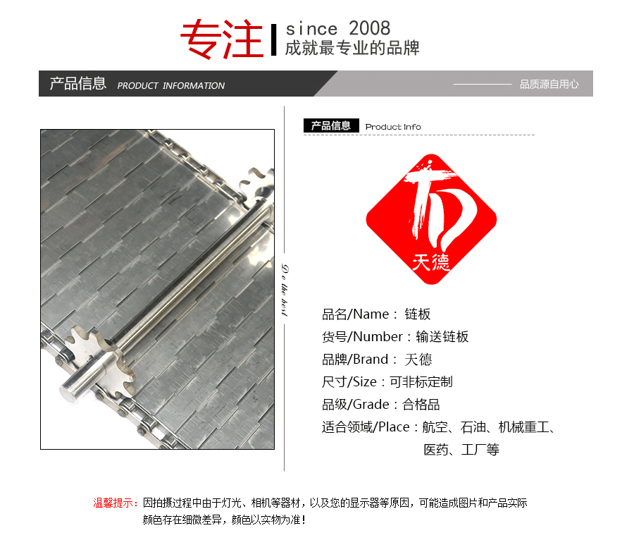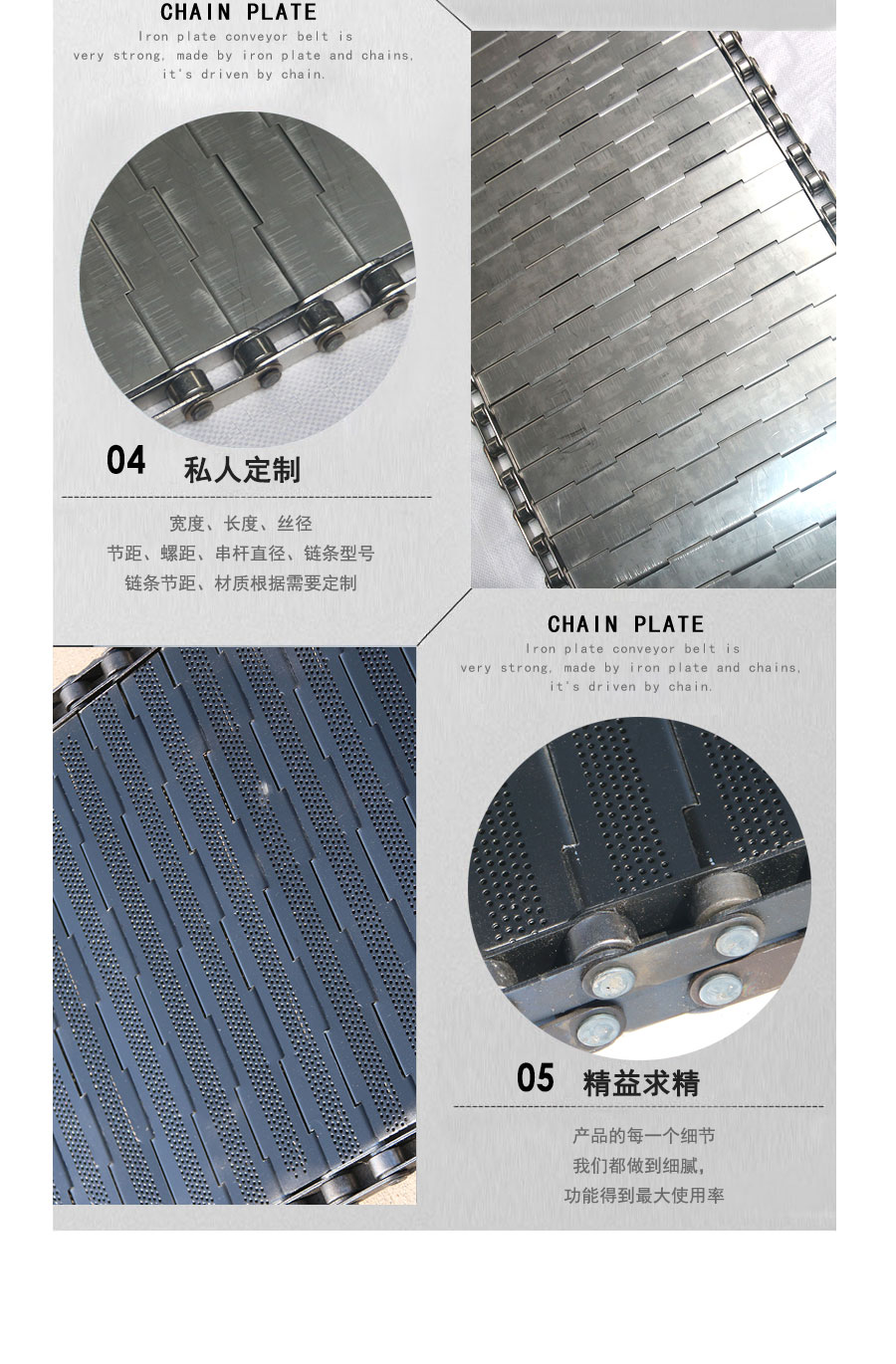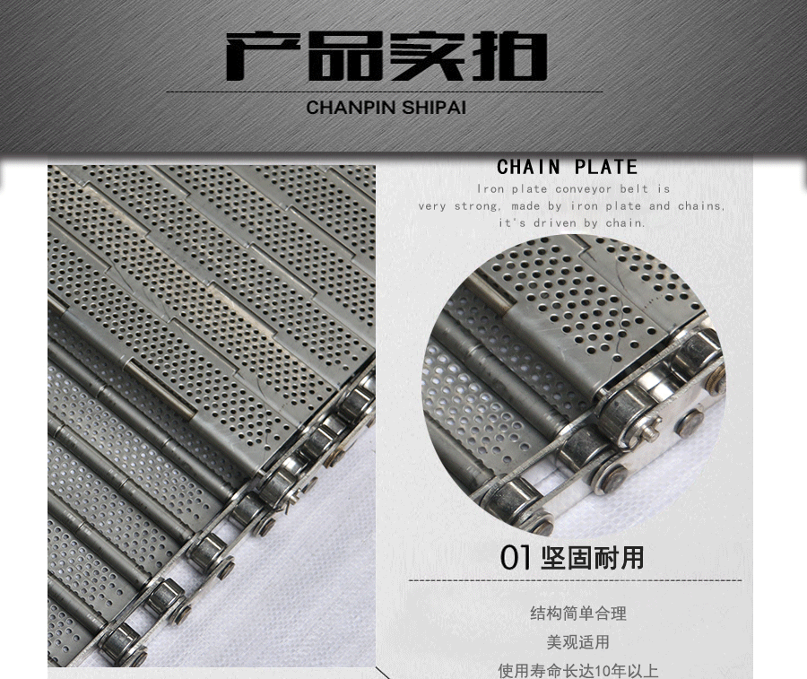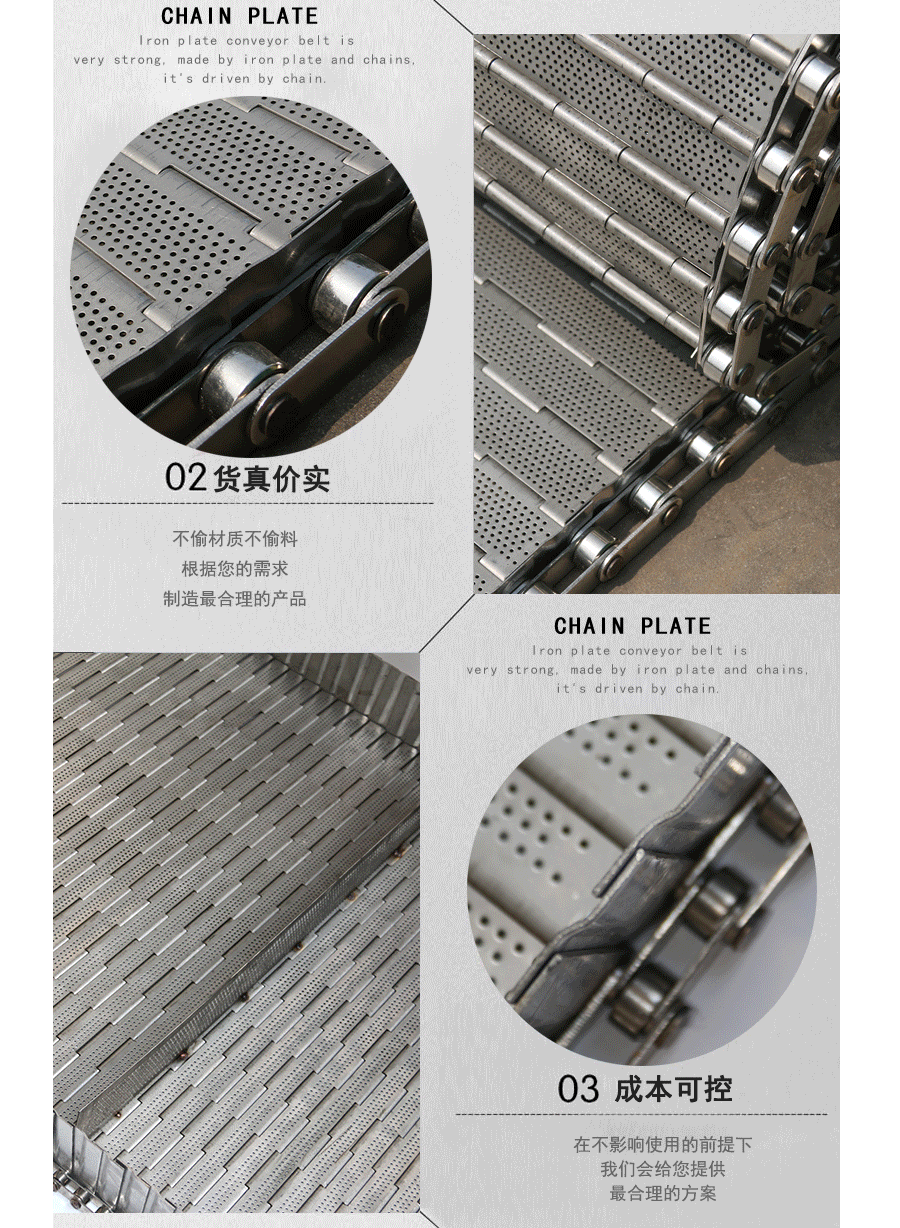 鏈板輸送帶:是采用不銹鋼板沖壓成型,鏈條傳動(dòng),每節(jié)由6-10mm支撐桿連接,其運(yùn)動(dòng)平穩(wěn)、力量大,適合用于輸送細(xì)小的高密度物件,輸送過(guò)程中運(yùn)轉(zhuǎn)平穩(wěn),安裝更換方便,成本高,使用壽命較長(zhǎng)。
