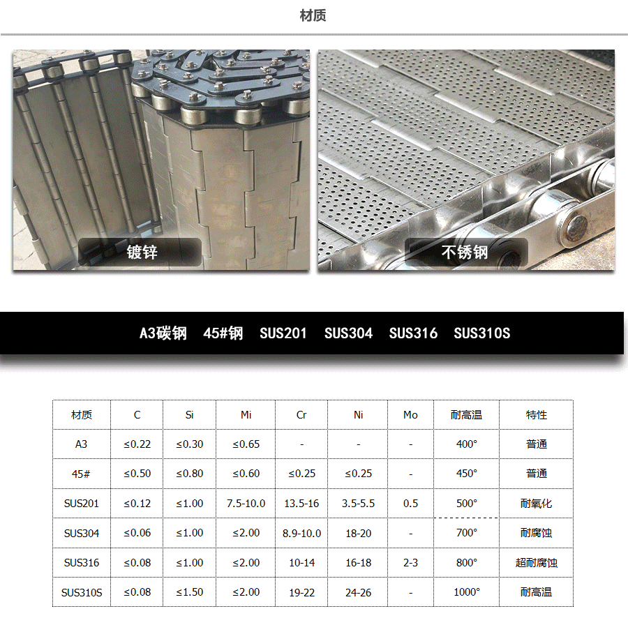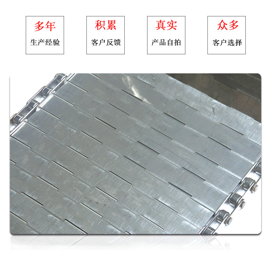 鏈板輸送帶材質(zhì):A3低碳鋼,45#鋼,201不銹 鋼,304不銹鋼,316不銹鋼等。