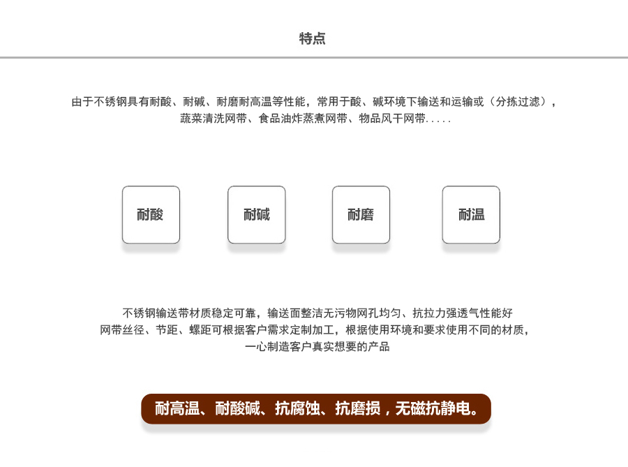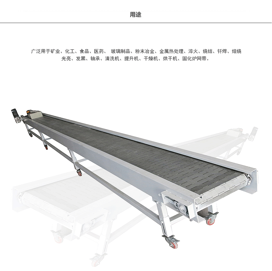 鏈板輸送帶應(yīng)用:鏈板式網(wǎng)帶廣泛用于玻璃制品行業(yè)的退火爐鏈板、烤花爐鏈板等。食品加工行業(yè)、脫水蔬菜、速凍食品單凍機(jī)前處理鏈板、鏈網(wǎng)。粉末冶金、金屬熱處理、淬火、燒結(jié)、釬焊、焙燒、光亮、發(fā)黑、軸承、滲碳高溫爐鏈板、擋板式鏈板、涂裝烘干線輸送鏈板、泡沫鎳還原生產(chǎn)線鏈板,清洗機(jī)、提升機(jī)、干燥機(jī)、烘干機(jī)、固化爐鏈板。各輸送工藝鏈網(wǎng)、鏈板、速凍、烘烤機(jī)械的平面輸送、螺旋輸送、食品機(jī)械的清洗,烘干、降溫、蒸煮等玻璃機(jī)械的退火、烤花、輸瓶等。